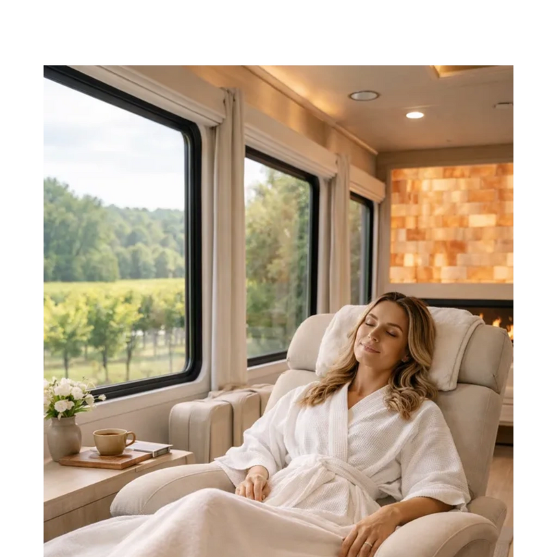 Private wellness experiences where salt therapy and guided stress support meet in a beautifully designed mobile studio.